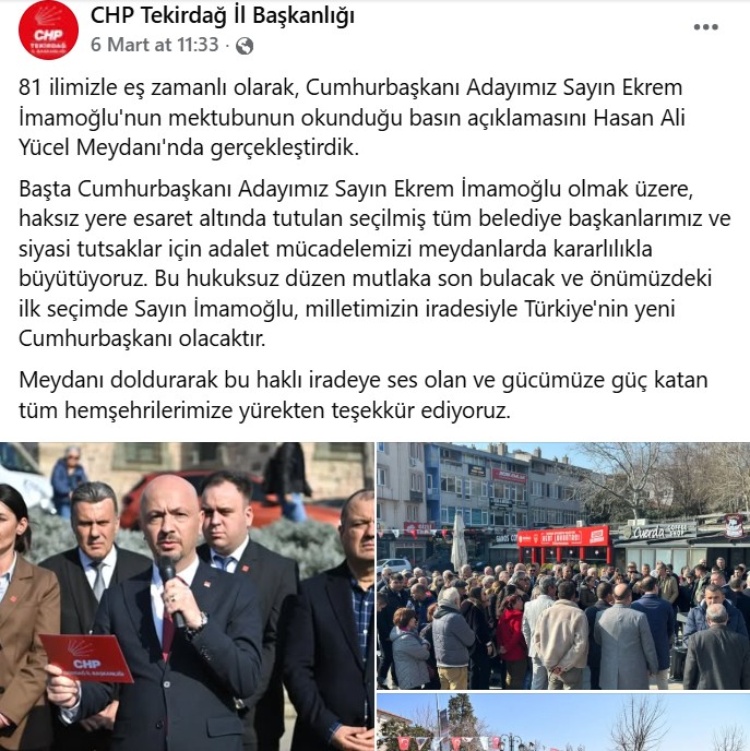 CHP Tekirdağ İl Başkanlığı tarafından düzenlenen basın açıklamasında, tutuklu bulunan İstanbul Büyükşehir Belediye Başkanı ve Cumhurbaşkanı aday adayı Ekrem İmamoğlu’nun cezaevinden gönderdiği mektup eş zamanlı bütün illerde okundu. Metin güçlüydü, cümleler iddialıydı, mesajlar yüksek perdedendi.