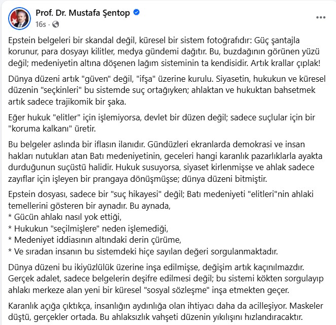 Hukukçu ve eski Türkiye Büyük Millet Meclisi Başkanı Prof. Dr. Mustafa Şentop, sosyal medya hesabından yaptığı paylaşımda Epstein belgelerini sıradan bir suç dosyası olarak değil, küresel düzenin nasıl işlediğini gösteren karanlık bir fotoğraf olarak değerlendirdi. Şentop’a göre bu dosyalar, tekil suçları değil; suçun nasıl sistemleştirildiğini gözler önüne seriyor.